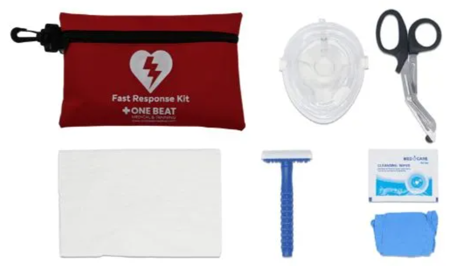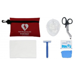 This CPR/AED Fast Response Kit contains tools and supplies typically needed for patient care and personal protection during the course of administering CPR to cardiac arrest victims.