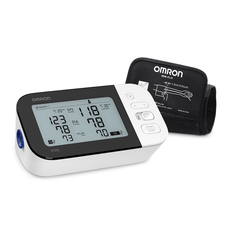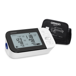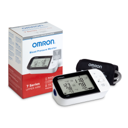 The OMRON 7 Series Wireless Bluetooth® Upper Arm home blood pressure monitor has a horizontally designed dual-display monitor and stores up to 120 readings (60 readings per each of two users), and includes a pre-formed Easy-Wrap ComFit Cuff (fits arms 9” to 17” in circumference).